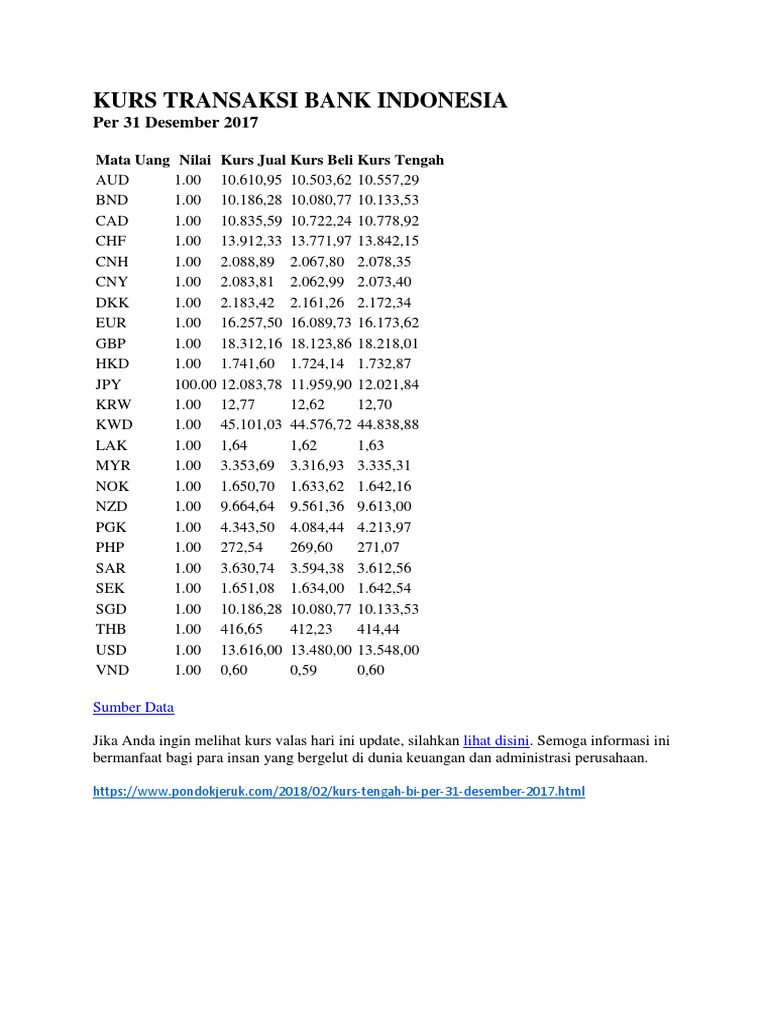 Daftar Kurs Tengah Bi Valas Per 31 Desember 2017 Lengkap